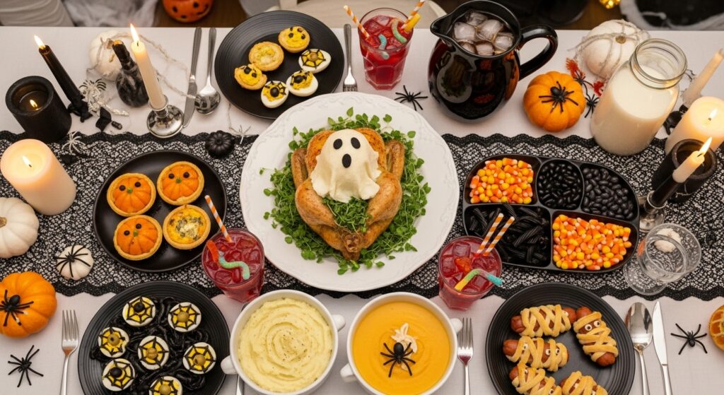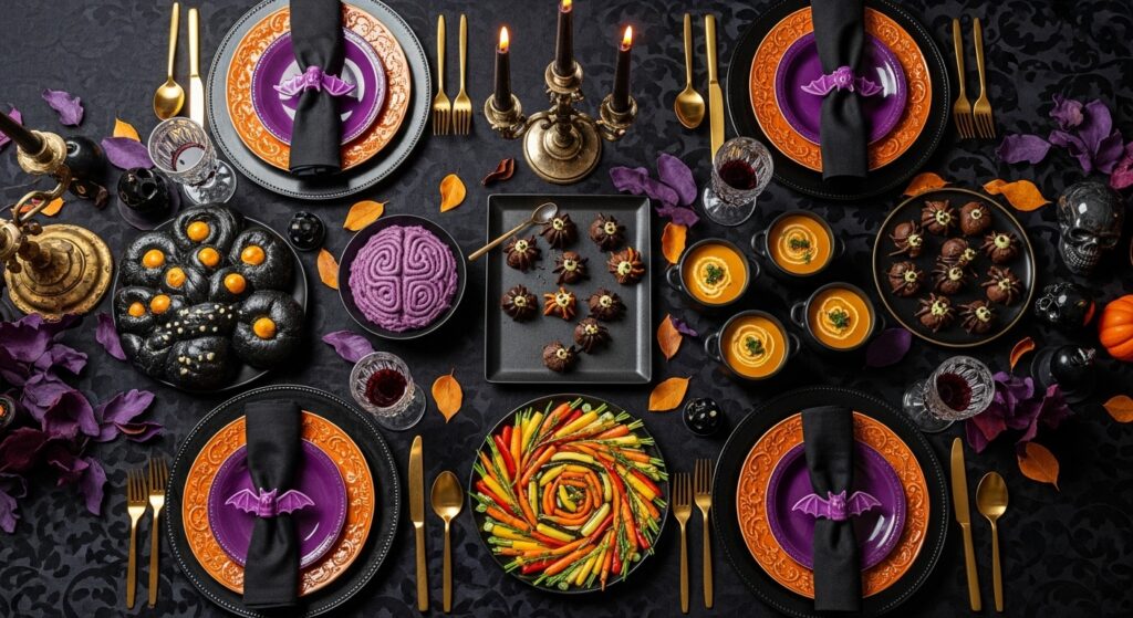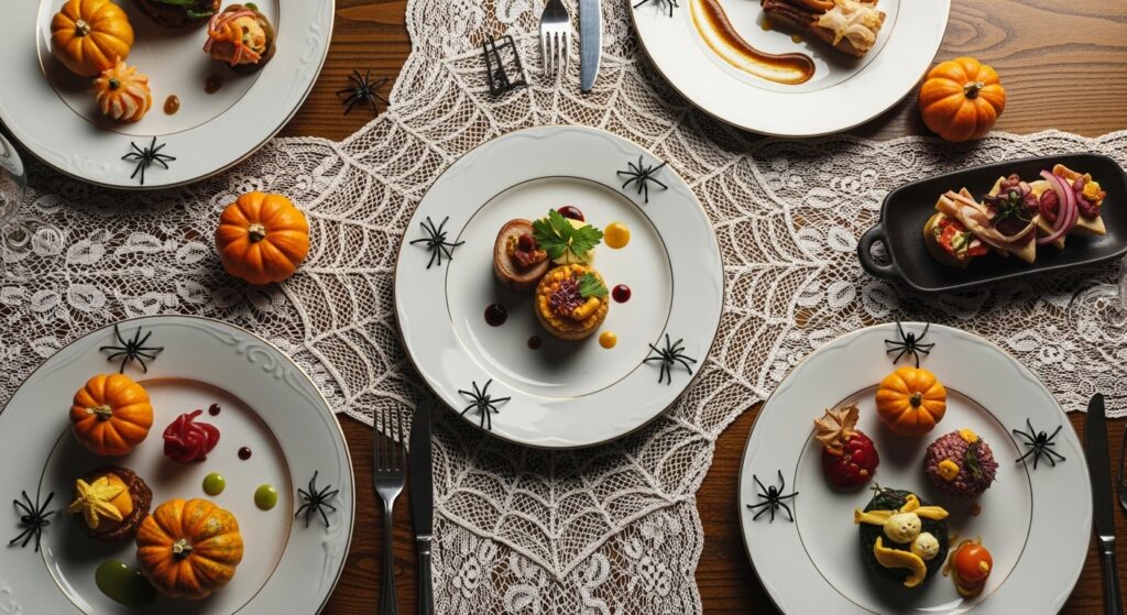 食器だけでなく、麻ひもやクモの巣状のレースをテーブルに敷いたり、小さなカボチャ(おもちゃでも可)を皿の端に添えたりするだけで、料理全体のストーリー性が増し、SNSで「凝ってる!」と褒められます。
