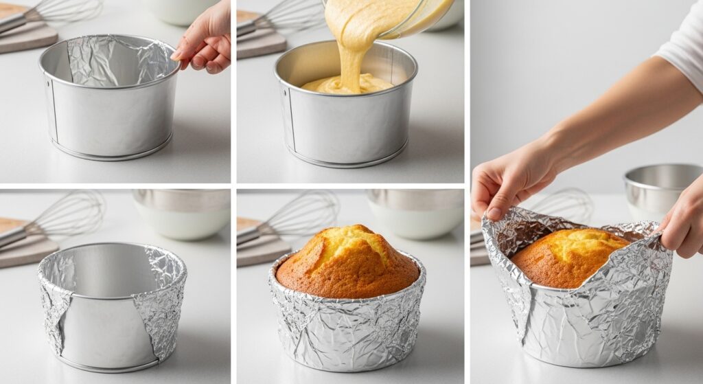 パウンドケーキ型にアルミホイルを敷き詰めてから生地を流し込む。焼き上がったらアルミホイルごと取り出せるため、型洗いが不要になります。
