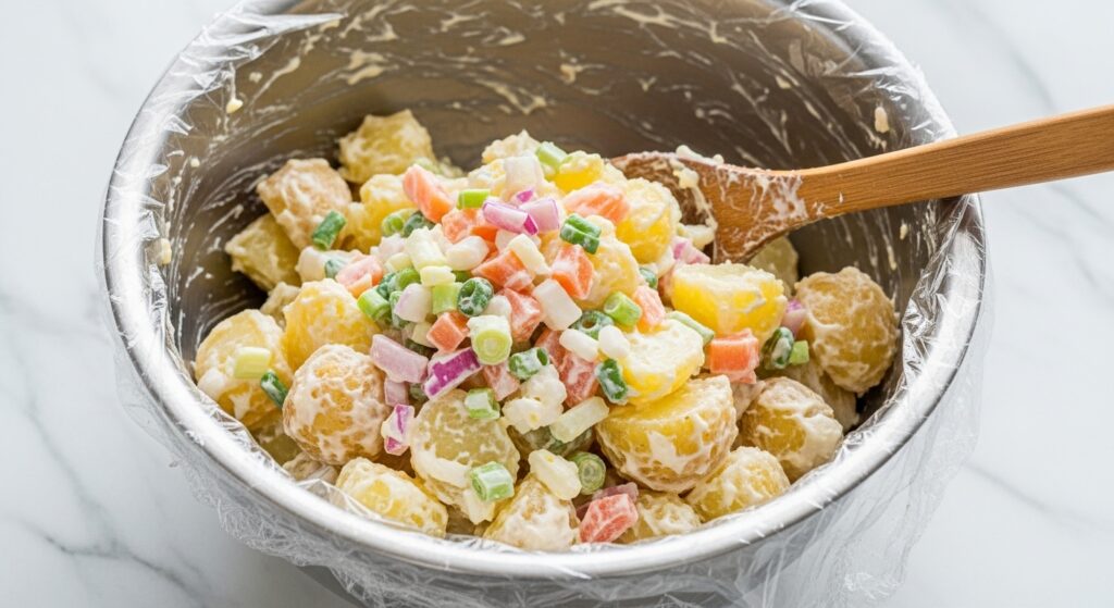 ポテサラを混ぜるボウルに、事前にラップを敷いてから具材を入れる。混ぜ終わったらラップを剥がすだけで、ボウルにポテトのネバつきが残らず、水洗いが劇的に楽になります。