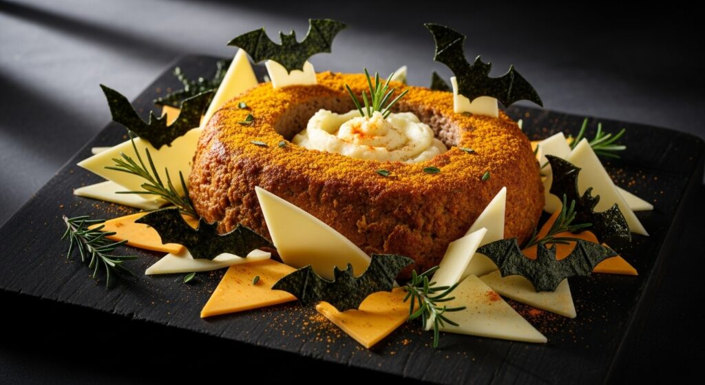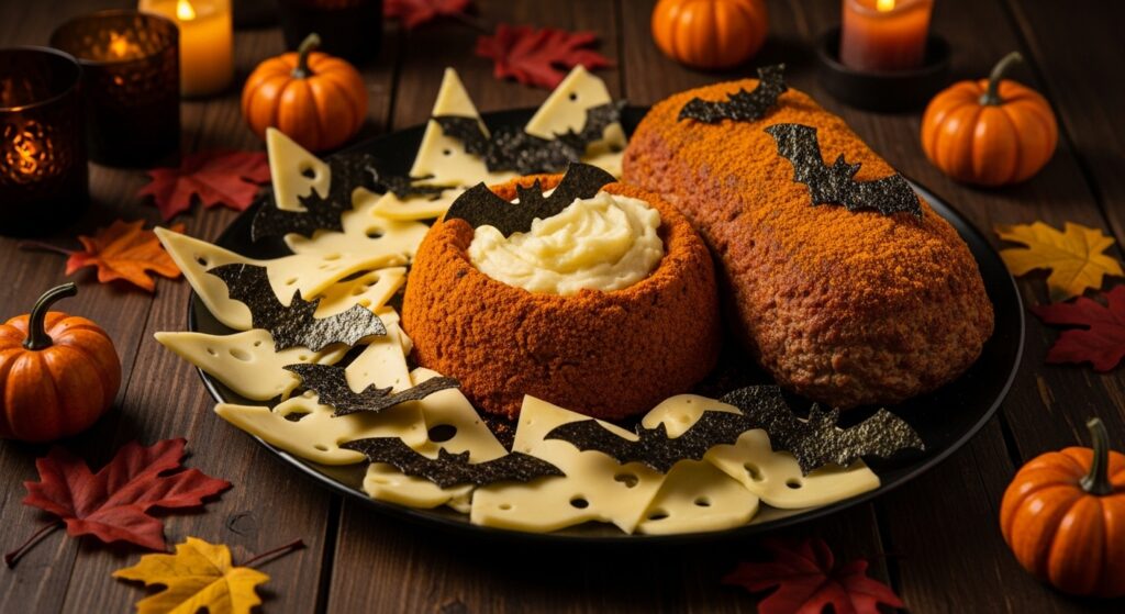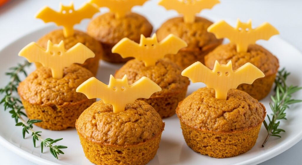 マフィン型で一人分サイズの小さなミートローフを作り、焼き上がりにチーズのコウモリを刺したピックを挿せば、取り分けが簡単で、冷めても絵になるフィンガーフードになります。