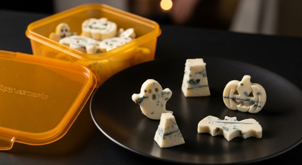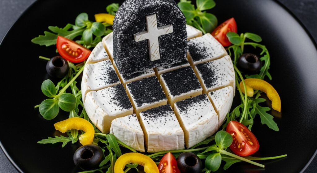 市販の丸いカマンベールチーズを四角くカットします。その表面に、竹炭パウダーをごく少量の水やオリーブオイルで溶いたものを刷毛で薄く塗ることで、一瞬で苔むした墓石のような質感が出ます。