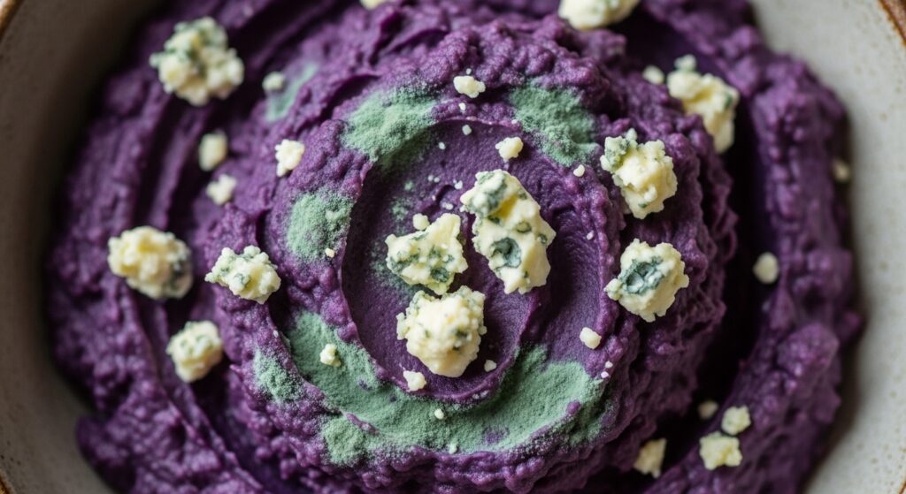 マッシュした紫いもに、刻んだゴルゴンゾーラチーズ(青カビ)を混ぜ込むことで、深みのある紫色に緑や青の点々が散りばめられ、カビが生えたような、リアルな不気味さを演出できます。