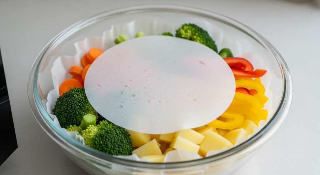 野菜をレンジで加熱する際も、ラップではなくクッキングシートを使うと、水滴が少なくなり、容器が汚れにくいです。