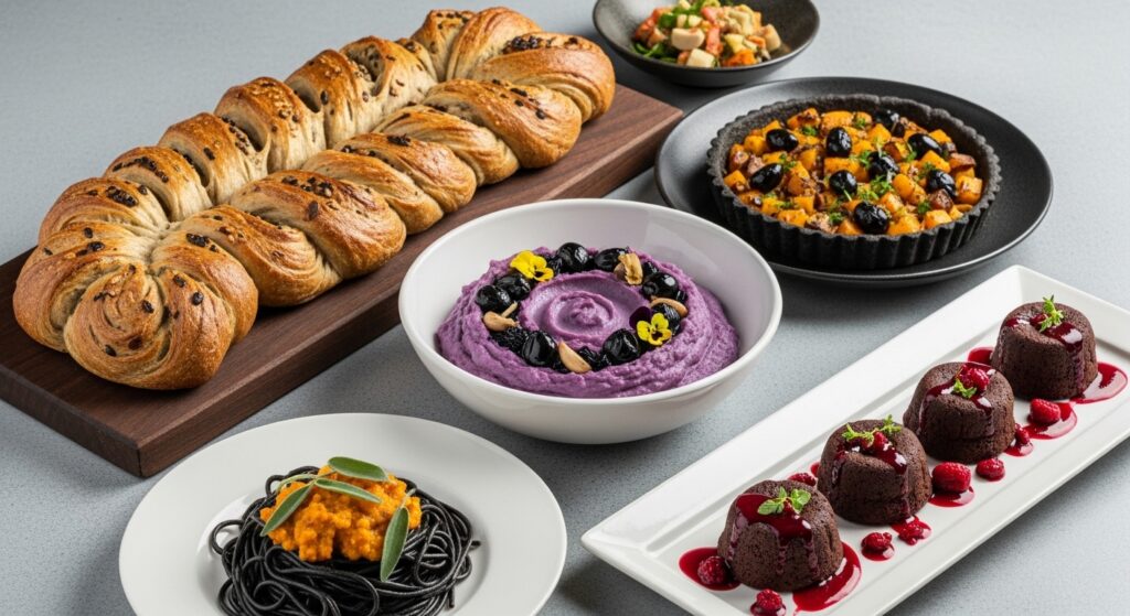 黒い大皿は、料理の鮮やかな色(オレンジや紫)を最も引き立て、一瞬で高級感と不気味さを演出します。特にミートローフや紫いもポテサラを乗せると、コントラストが際立ちます。