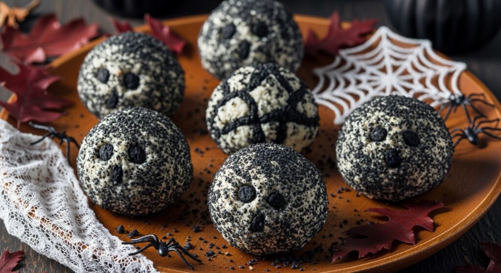ポテサラを丸く成形した後、黒ゴマや細かく砕いた竹炭ビスケットで表面を軽くコーティングします。