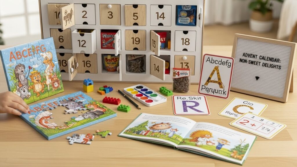 24〜50ピース程度の小型パズルを用意し、カレンダーの窓ごとに2〜3ピースずつ分けて入れます。毎日ピースを少しずつ集め、24日に「完成させる」という長期的な目標を持たせることができます。
