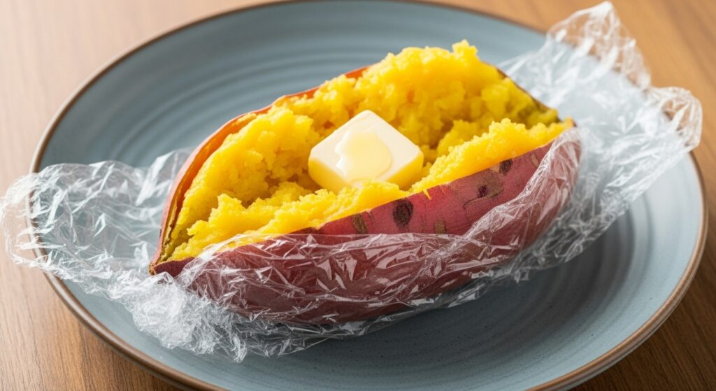 1.さつまいもを洗い、濡れたままラップで