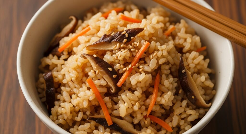 炊飯器いらずで炊き込みごはん風に。香ばしいごま油とまいたけの香りが広がります。