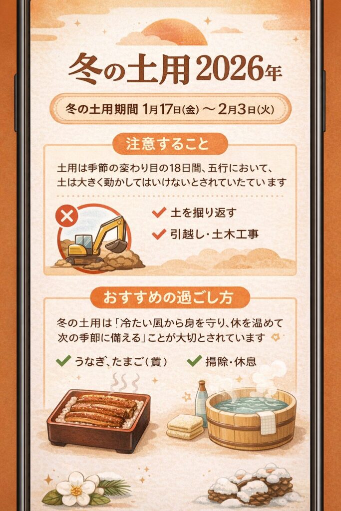 - 2026年冬土用の間日:1月23日(金)、1月24日(土)、1月26日(月)