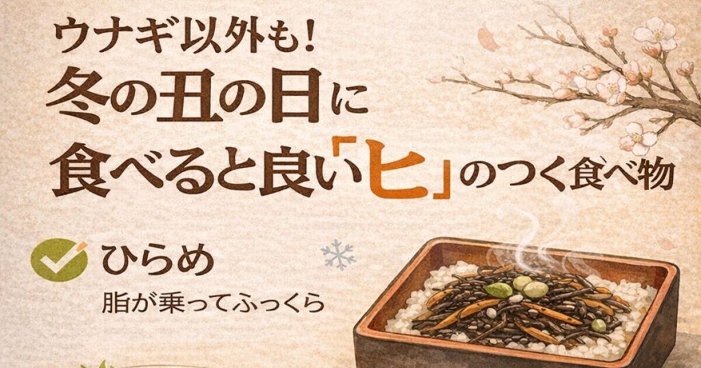 「ヒ」がつく代表格であり、鉄分や食物繊維が豊富です。冬土用はデトックス(毒出し)の時期でもあるため、腸内環境を整えるヒジキは理にかなった食材と言えます。