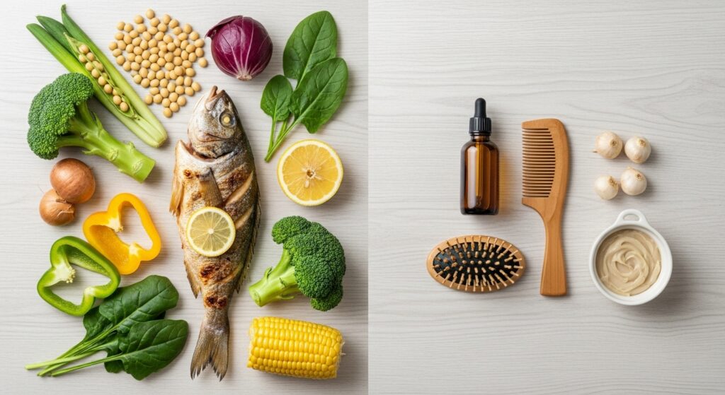 さらに、睡眠不足やストレス、食生活の乱れも重なると、髪に必要な栄養素(たんぱく質・鉄分・亜鉛・ビタミンB群など)が不足し、髪質の悪化が加速します。